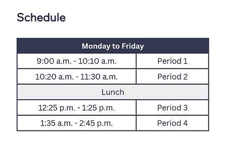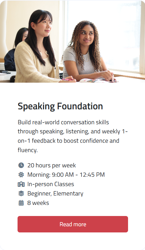 FOC (Focus on Communication)口說強化課程 專注於培養口說自信、擴展詞彙量並提升發音,幫助學生在各種情境中有效且自如地溝通。 課程結合上午的口說訓練時段與下午 FOC 學生工作坊,學生可每週更換工作坊主題,自訂學習內容以符合個人需求。 課程每月包含一次免費的 Chat Buddy 活動(每週 3–5 小時),由加拿大當地夥伴協助學生在課堂外練習會話,同時體驗加拿大生活與文化,提升口說流暢度與實際運用能力。 |