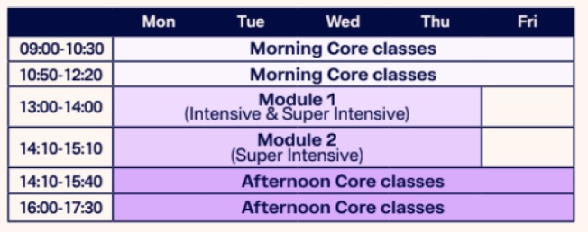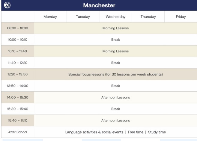 曼徹斯特校區採固定上午或下午的課表上課。