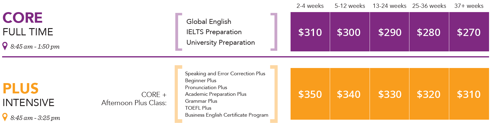 每週36堂課 (Core Classes+ Elective Choice + Afternoon Plus)