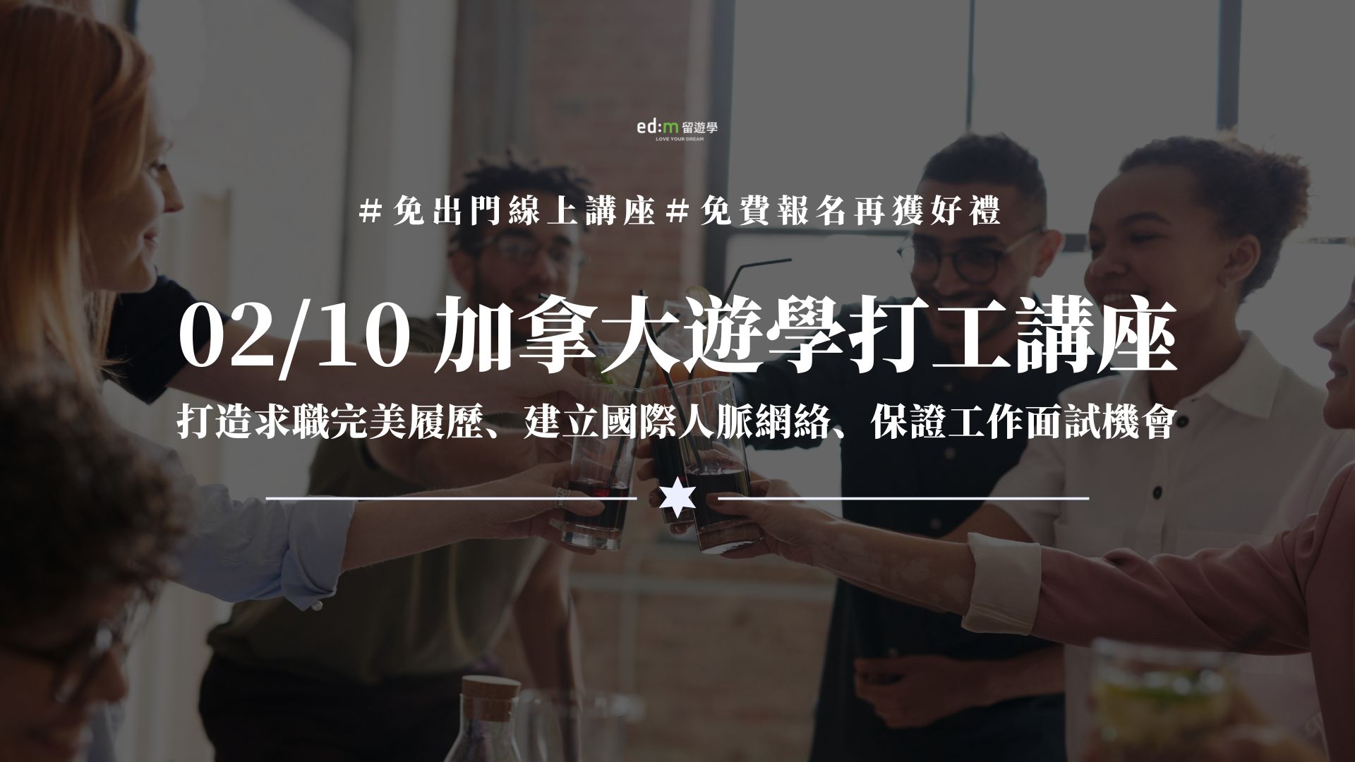 因為疫情猶豫不決?不知道何時該前往加拿大遊學打工?ed:m遊學協助你免費規劃加拿大遊學打工行程,02/10(四)加拿大遊學打工線上講座,我們將不藏私分享疫情後加拿大遊學打工趨勢課程、就業現況、申請流程/費用/薪資結構、與超值優惠資訊!
