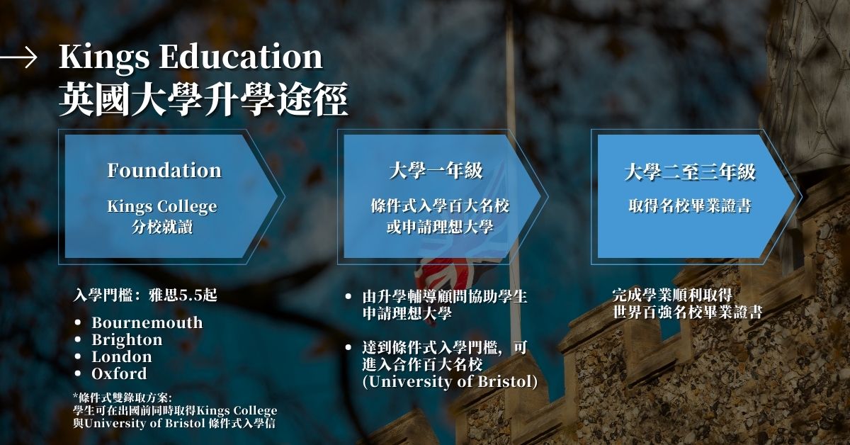 Kings Education國際教育集團已有60年教學經驗,提供以學生為中心的教學方式,透過小班制的教學、各學科專業教師、個人化升學輔導、專業大學選校協助等完善的學生照顧,帶領著學生順利從高中銜接至理想大學。