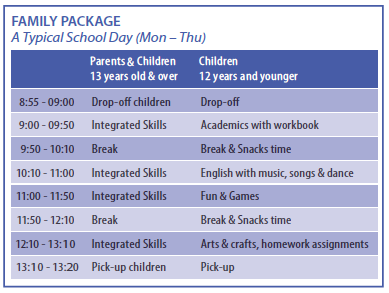 週一~週四 9:00-13:10 *學校提供課外活動 (免費或付費),讓親子一同參加 |